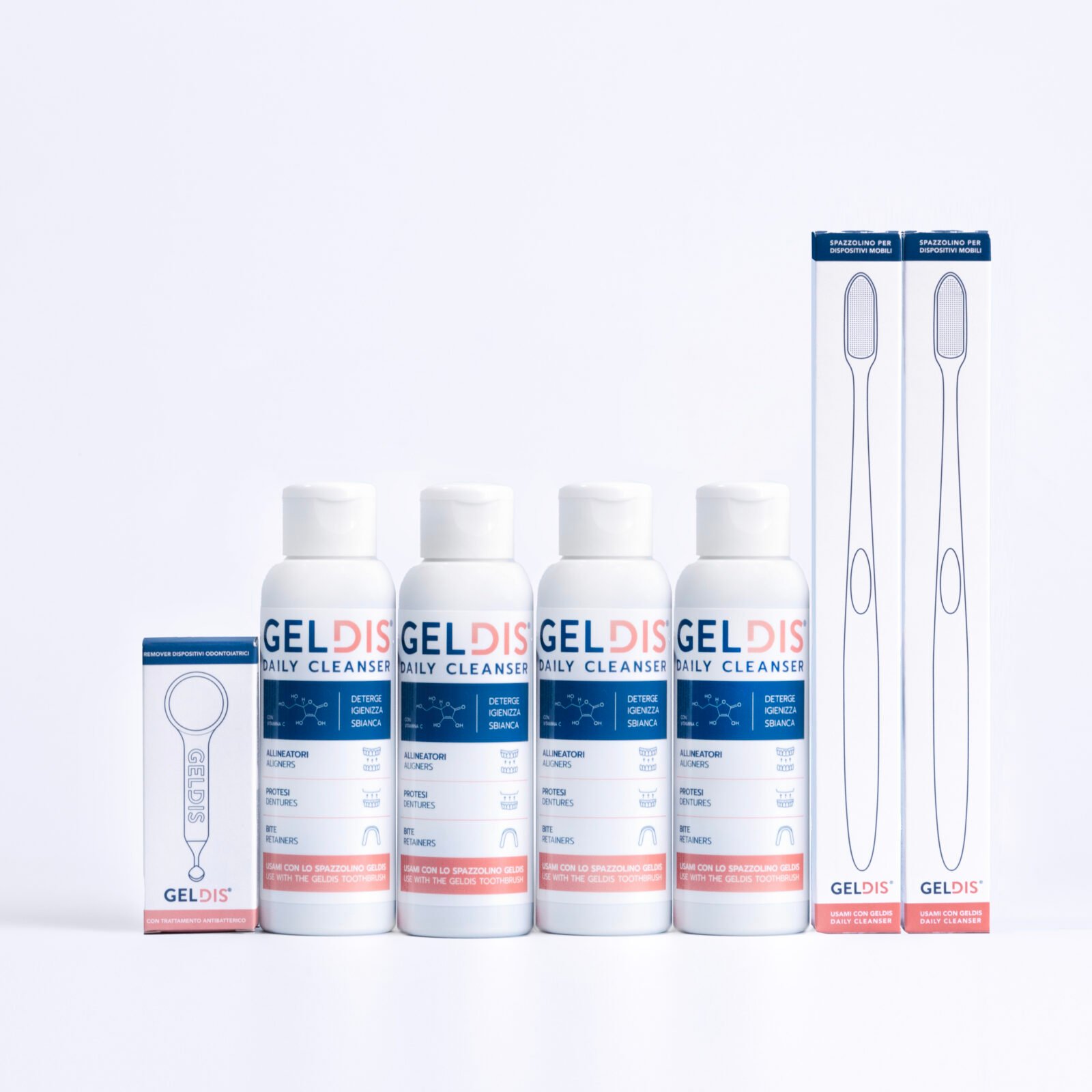 Kit di 7 prodotti per l’igiene completa di allineatori, bite, apparecchi trasparenti e mobili.